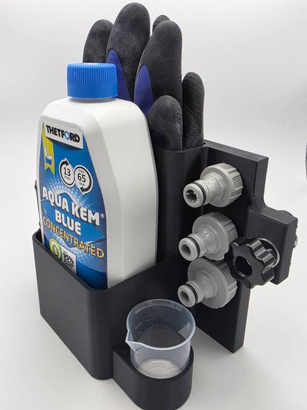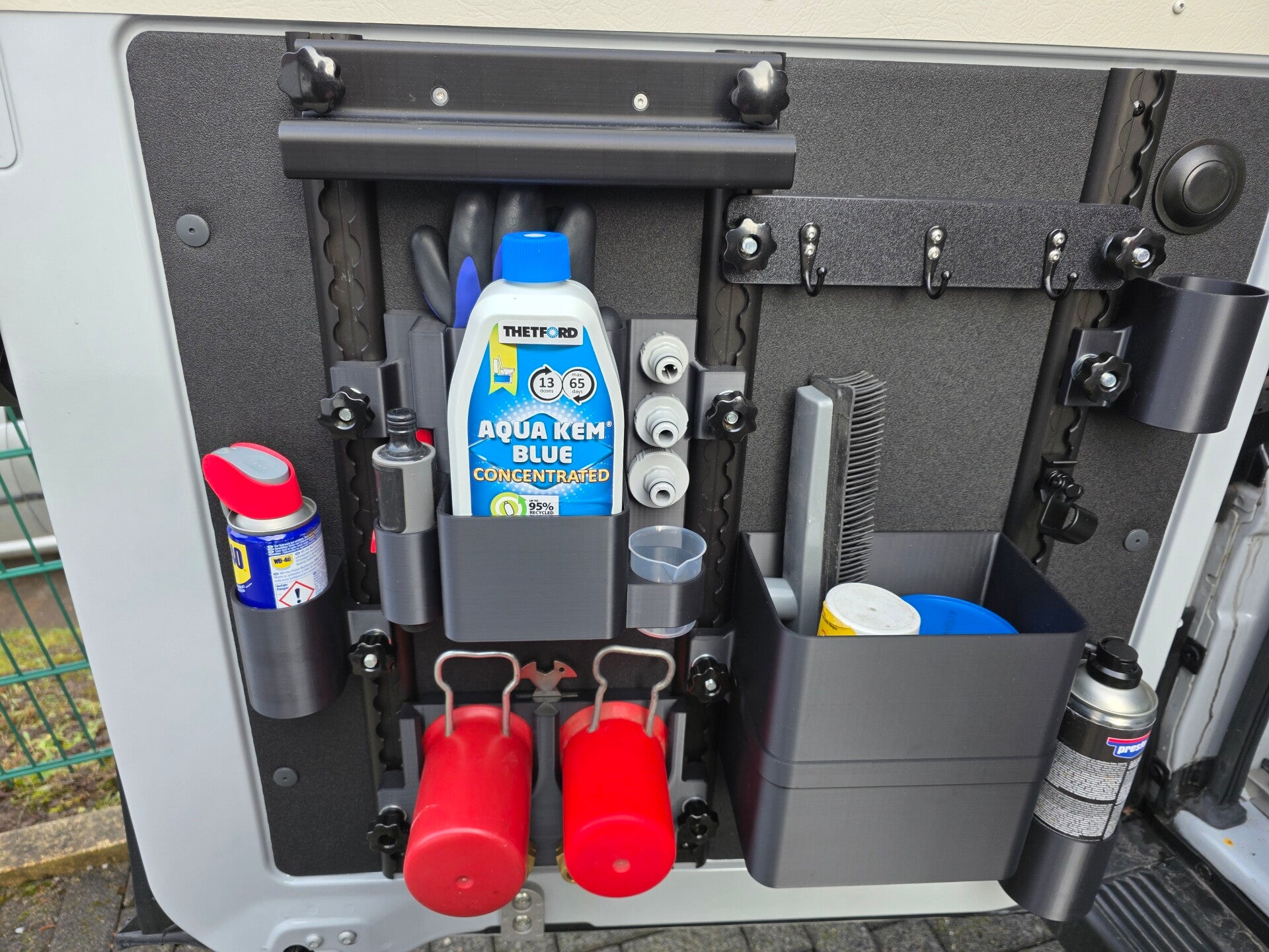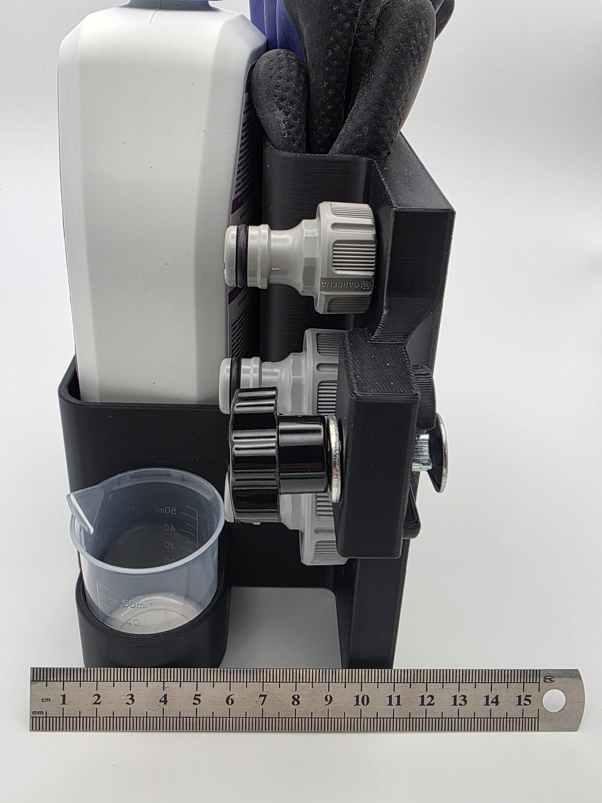 Es findet sich Platz für eure Wasseradapter von Gardena und auch der Wasserspritze . Über einen Magnet wird der Grauwasserschlüssel in Position gehalten. Auch für eure Handschuhe ist Platz in diesem tollen Modul. Ein Messbecher zum exakten Dosieren liegt bei.